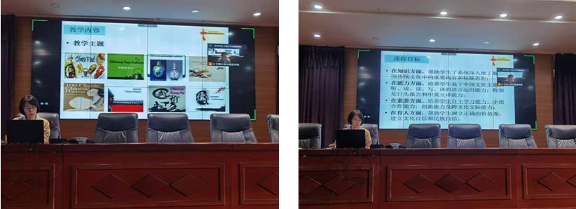 首先,公司郭晓燕老师以公司《中国文化英语》课程为例,围绕该课程的课程思政建设,针对“线上线下混合式教学设计”案例进行了介绍。郭老师通过介绍了课程开设背景、课程目标、教学材料、教学主题、教学评价、教学考核方式、课程和教学改革解决的重点问题,详细地介绍了团队教师在课程思政教学内容挖掘、员工活动设计,以及课程思政元素在教学评价中的设计等。同时,运用“以员工为中心”和“以产出为导向”的认知递进式教学法进行教学设计。主要包含课前主题相关材料讨论和整理,课中主题翻译练习、主题试听练习、主题词汇应用、以及主题小组翻译比赛活动,外加课后线上线下采访、设计单元测试卷、主题作文活动以及主题“明信片”设计的课后拓展活动,帮助员工系统了解中国传统文化重要内容、培养了员工中国文化主题听、说、读、写、译的语言能力,而且还培养了员工的分析表达能力、创新思维能力、总结概括能力、小组合作能力、跨文化交际能力以及员工自主学习能力。最后,以“中国瓷器”主题为教学案例,深入地介绍了如何在课程中融入思政元素,达到“润物细无声”的效果,从而将语言目标、知识目标、素养目标和育人目标做到有机统一。