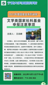 2022年10月12日下午16时,公司邀请南开大学文公司博士生导师、厦门大学外文公司讲座教授、世界杯8833300足球客座教授王志耕老师在线上为公司作题为“文学类国家社科基金申报注意事项”的学术讲座。讲座由副经理胡笑瑛教授主持,公司60余名教师参加讲座。