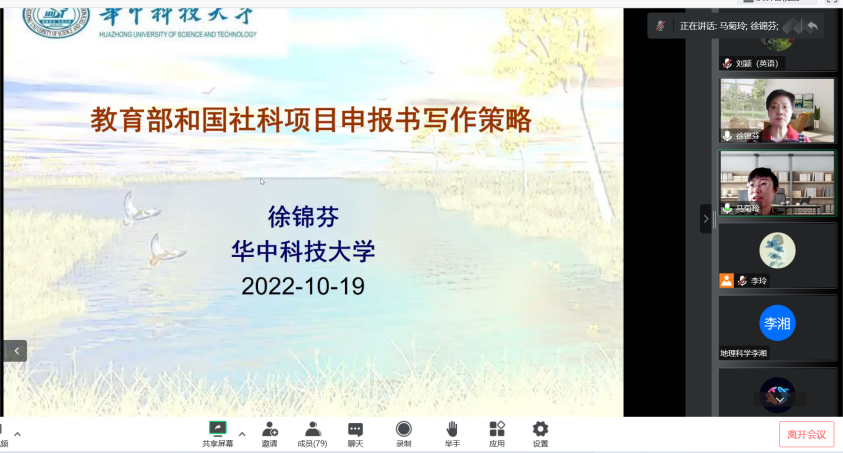 2022年10月19日下午15时,应世界杯8833300足球邀请,华中科技大学世界杯8833300足球教授、博士生导师、国务院政府特殊津贴专家徐锦芬教授在线上为公司教师作了题为“教育部和国社科项目申报书书写策略”的专题讲座,世界杯8833300足球副经理马菊玲教授主持讲座,公司全体教师及学术型研究生参加了讲座。