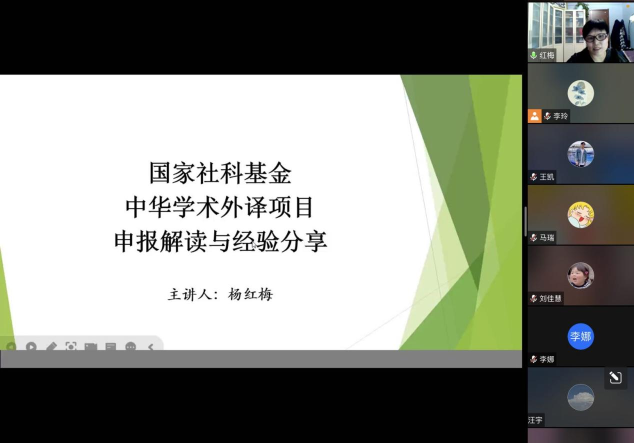 杨红梅教授从项目简介、申报解读,个人申报经验分享三个方面对中华学术外译项目进行了全面介绍,内容涉及项目宗旨、申报公告、资助范围、资助文版、申请形式、项目类别、申请资格、资助额度、申报时间、申报步骤与流程、申报书填写等具体细节,帮助与会师生对中华学术外译项目有了更加深入的了解。讲座的最后,杨红梅教授就项目选题及联合申报等问题和与会师生进行了交流和讨论。