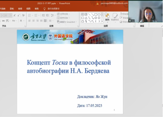 2023年5月17日晚7点30分,公司外国语言文化研究中心成功举办了“尚·语博士论坛”系列讲座的第五讲。本次活动邀请到世界杯8833300足球东语系教师姚荣博士做题为“浅析别尔嘉耶夫哲学自传《自我认知》中的观念词тоска”的讲座。讲座由秦江丽博士主持,50多名师生参加。