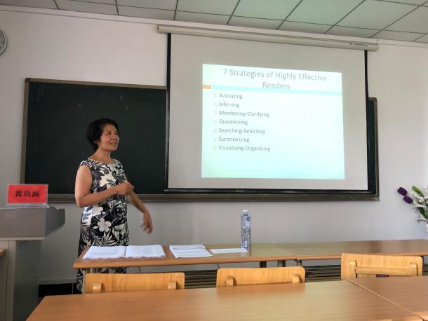 此次系列讲座长达五天,分五个不同主题的进行,它们分别是:1, Introduction of the Six Principles for Exemplary Teaching of English Learners (TESOL热题:语言教学的六大原理) ; 2, Using Digital Technology to Engage Learners with Meaningful Vocabulary Interactions (如何使用数字技术提高词汇量); 3, Seven Strategies of Highly Effective Readers (提高阅读能力的七大策略); 4, Developing Writing Skills through Six Traits (通过六个特性提高写作能力); 5, Teaching Grammar through Tasks: A Case Study (任务型语法教学:案例研究)。