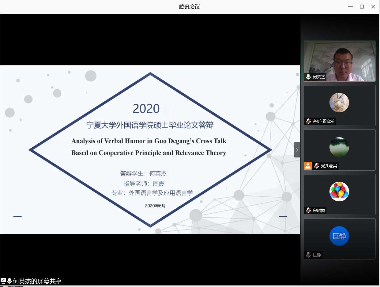 答委老师们细致尽责的在论文格式、表达、逻辑、行文多方面给同学们进行了指导。对各位员工的毕业论文提出了问题和建议,其中问题主要集中在翻译策略和方法的运用,并提出了有关论文语法,用词,策略等方面的建议。员工通过线上展示论文相关内容和回答各位答委的问题,充分展示了一名研究生所具备的专业素养,每位同学虚心听取老师的意见与建议,并表示会继续深入学习相关理论知识,现场学术氛围非常浓厚。