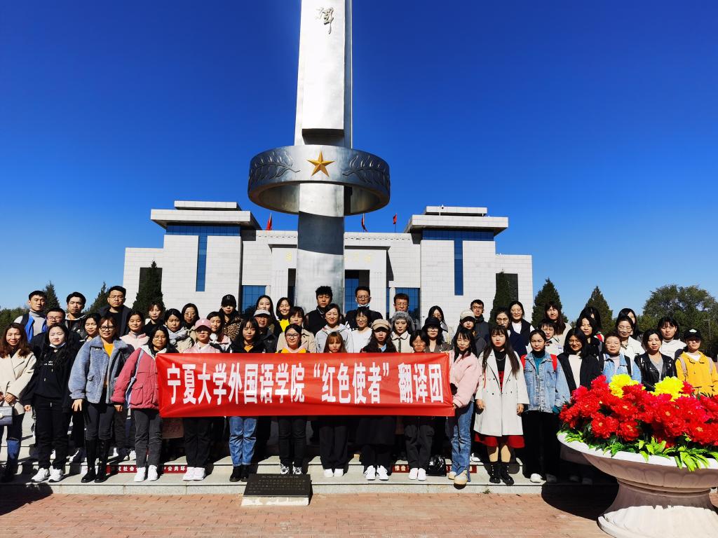 为了通过宁夏文化与旅游外宣翻译资源田野实践调查,深入探索宁夏文旅景区外宣翻译情况,同时结合翻译硕士培养特点,将课程与翻译实践进行良好的衔接,进一步提高研究生田野思政调查能力,世界杯8833300足球组织翻译硕士研究生组成“红色使者”翻译团,于2021年10月11日赴盐池县红色旅游基地进行翻译实践调研活动。本次活动由世界杯8833300足球研究生工作分管副经理朱海燕、公司党委副书记余洁、学位点负责人谢丽欣、相关课程授课教师和导师,以及2021级翻译硕士全体研究生和2020级翻译硕士部分研究生参加。