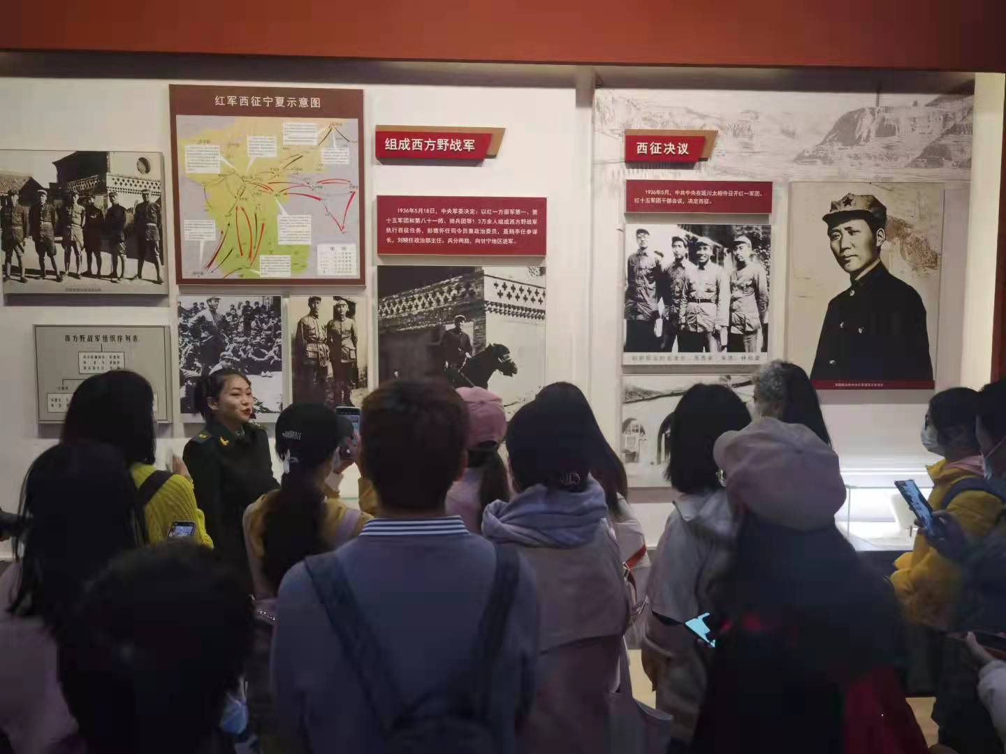 团队一行首先到达盐池县革命纪念馆,在讲解员的带领下,大家了解了盐池县在陕甘宁革命老区中发挥的重要作用,也对馆内标志牌、展品牌进行拍摄,共同探讨标识语的英文翻译版本。大家在聆听讲解的同时,也注意观察标示牌上不同历史事件的文字介绍和英文翻译,发现了其中许多英文翻译仍存在需要改进的地方,这次活动使得大家在革命精神的熏陶中加深了对生活实际语境中的翻译的认识。