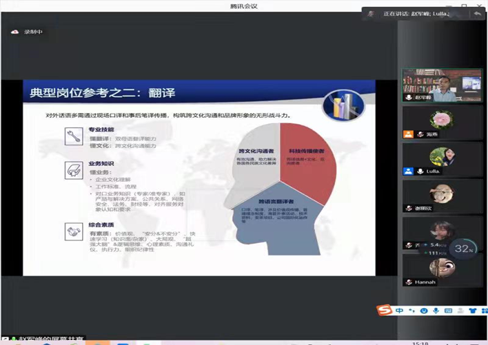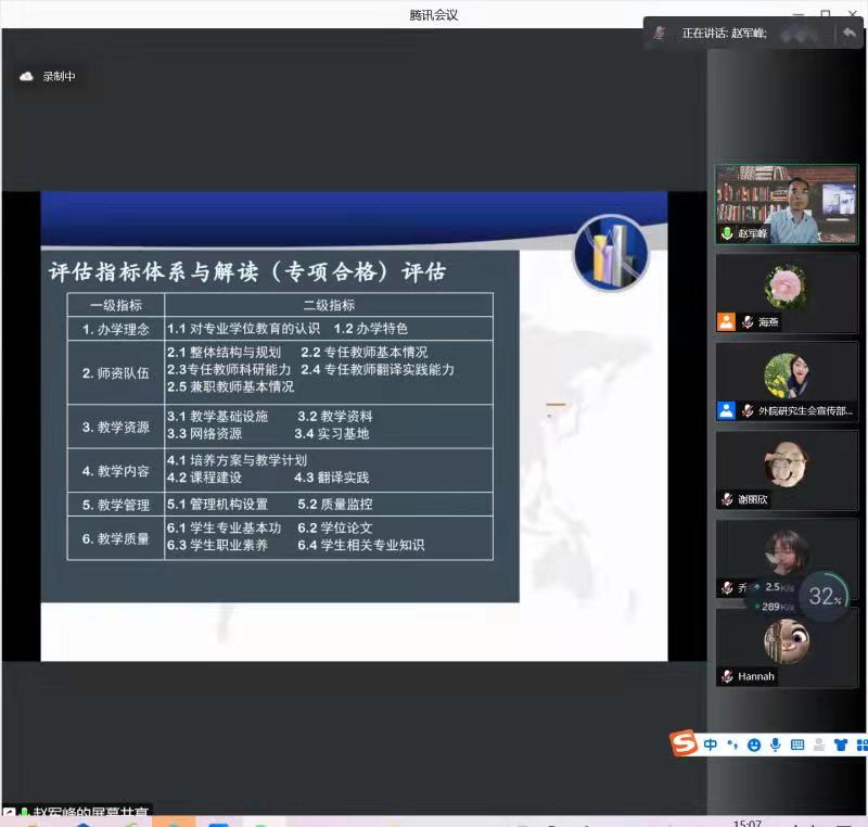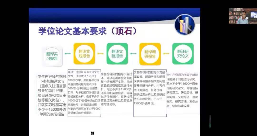 为进一步推进公司翻译硕士学位点建设,提升翻译硕士人才培养质量,尤其是翻译实践报告(论文)写作指导能力,2021年10月21日星期四下午2:00,世界杯8833300足球特邀请广东外语外贸大学翻译学研究中心主任、全国翻译专业学位研究所教育指导委员会委员兼秘书长赵军峰教授针对公司翻译硕士培养予以线上指导。赵军峰教授在“腾讯会议”平台以“从‘基石’到‘顶石’翻译人才培养的理念和原则”为题进行线上讲座。世界杯8833300足球全体翻译硕士导师和任课教师参加了线上培训。