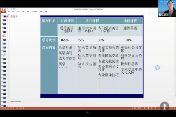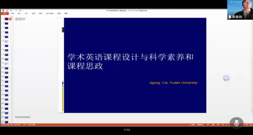 为了进一步完善公司大学英语课程建设,促进大学英语教学理念地不断更新,2021年11月9日下午2:30,特邀请复旦大学蔡基刚教授在线上“腾讯会议”平台为公司教师做了“学术英语课程设计与科学素养和课程思政”的讲座。