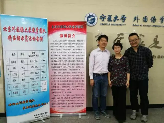 3月30日北京外国语大学的陈掘斌、王文丽和翟铮老师分别走入17级、16级和15级的课堂中,为各班同学讲授了专业核心课《基础英语》、《语音》课,语言技能课《写作》、《听力》课和专业必修课《文学》、《翻译》课。《基础英语》课上,陈老师将大家带入公元前 4世纪亚历山大国王和古希腊哲学家戴奥吉尼斯的会面中,并引导我们对比两位伟大的历史人物在装扮、性格,思想等方面的不同,使大家对犬儒主义有了深入的思考。王老师在《语音》课上,选取了许多贴近生活的音频、影视素材,还融入了儿歌、游戏等教学方法,即简单、有效地训练员工掌握了重读、节奏和连读的要领,分析了汉语的负迁移问题,还讨论了诗歌的主题巧妙地融入在韵脚中的规律及特点。