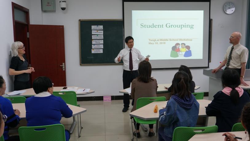 2018年5月10日下午2:15,来自唐涞中学的十四名英语教师在世界杯8833300足球213教室参加了“唐涞中学英语教师第三期教学技能提升培训”。世界杯8833300足球外籍教师Melissa Smith和Dale De Weerd应邀就“在英语课堂中如何进行分组活动”做了现场教学展示。
