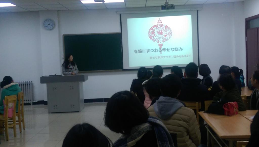 此次日语角由日语专业三年级的员工主办,以春节为主题,进行了主题演讲与讨论。首先,日语专业二年级的员工用日语图文并茂地向日本来宾介绍了中国春节期间的独有现象——春运。随后,三年级的员工也用日语讲述了春节期间各种各样的经历和体会。由于话题贴近老员工的生活,演讲过程中不时爆发出阵阵掌声与笑声。日本来宾也有感而发,讲述了自己在中国过年的经历。演讲过后的游戏互动环节,日本友人与两校员工共同参与,拉近了彼此的距离,使得接下来的交流讨论中大家能够敞开心扉,畅所欲言,将自己所经历过的、感受过的春节的种种,用日语进行交流。