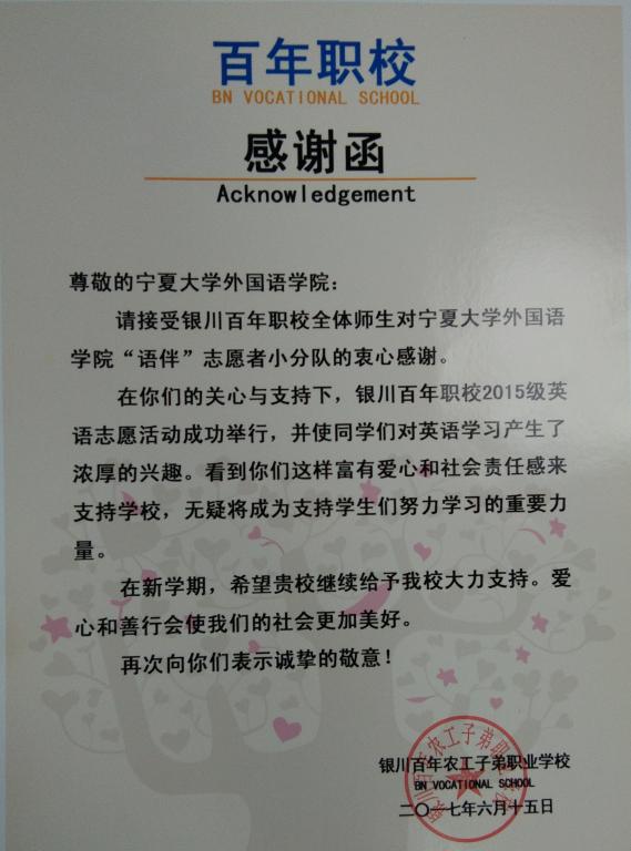 本学期,公司与百年职校的帮扶活动开展以来,先后有2015级6个班的80余名员工分批次到职校开展志愿服务活动。他们精心准备、积极参与,不辞辛苦,充分体现了公司员工的精神风貌和“语伴”志愿服务项目“尽我所学,与你为伴”的志愿精神,在此,对参加百年职校英语帮扶活动的志愿者们说一声,你们辛苦啦!