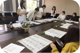 “三字”书写结束后进入普通话比赛环节。选手们现场抽取普通话演讲话题,准备5分钟后完成3分钟的话题演讲。普通话比赛由马真、王奕文和王颖(日)三位老师担任评委,演讲内容、语言表达和综合印象为主要评分原则。比赛过程中员工们精神饱满、语调自然、思想内容紧扣主题,观点鲜明、内容充实生动。
