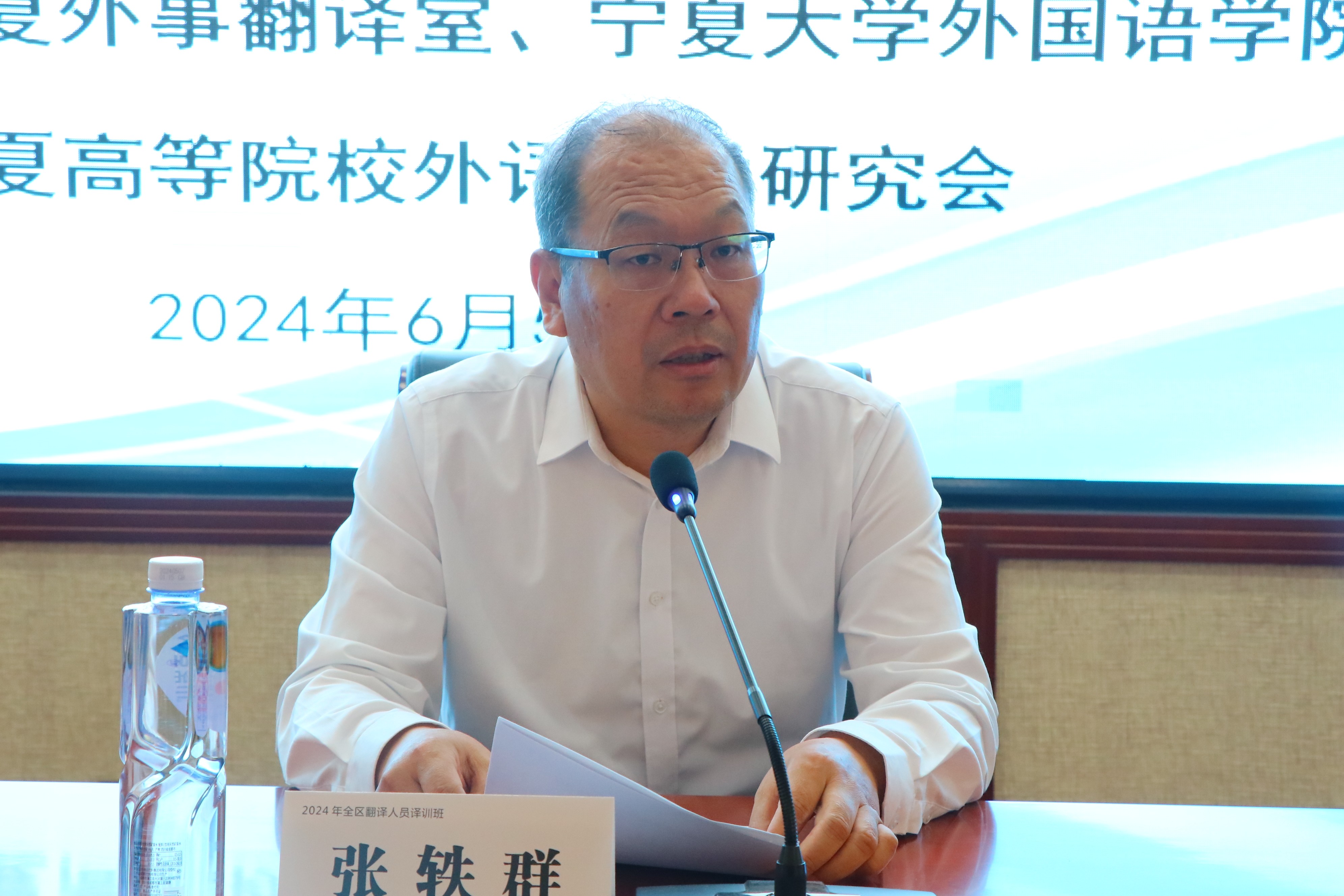 6月5日,由自治区党委外事办公室主办,宁夏外事翻译室、世界杯8833300足球承办,宁夏高等院校外语教学研究会协办的2024年宁夏回族自治区翻译人才译训班在世界杯8833300足球怀远校区逸夫楼一楼报告厅正式开班。本次培训班汇聚了来自宁夏回族自治区党委外事工作委员会成员单位、五市涉外系统、国企的英语干部以及高校英语骨干外语教师近100人,共同开启为期三天的系统翻译学习之旅。