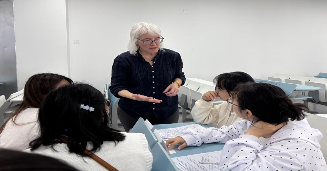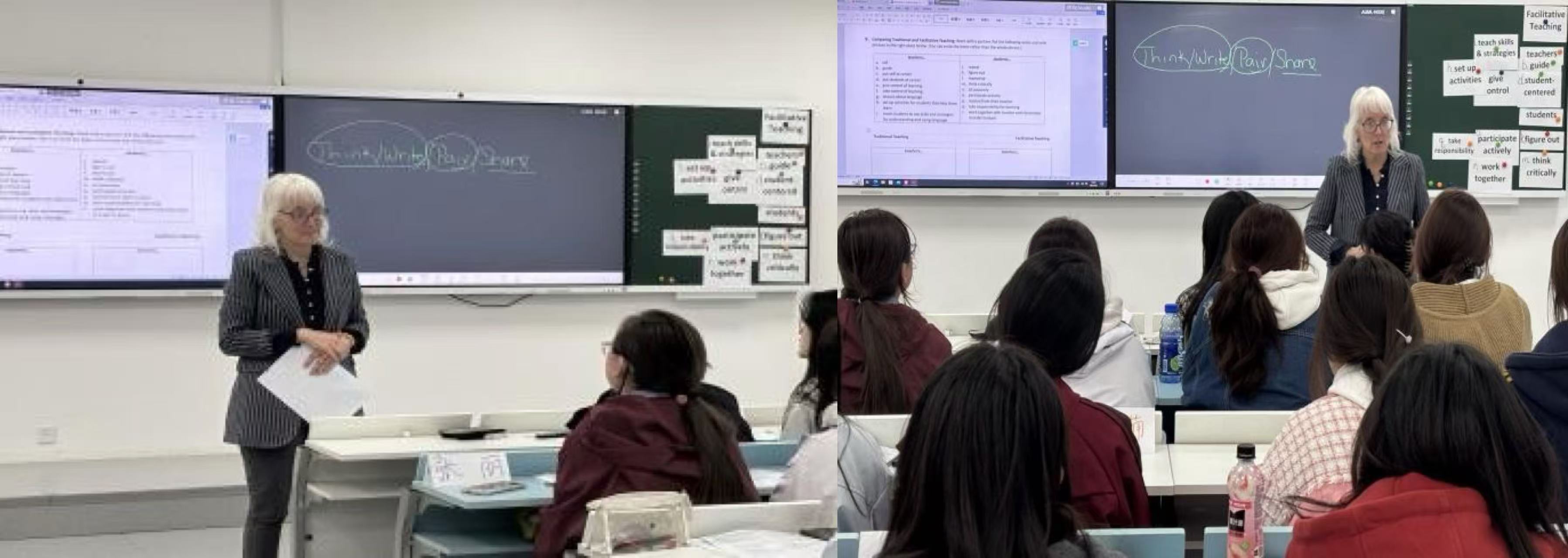 “卓越英语教师工作坊”活动是卓越教师培养计划的有机组成部分。公司邀请英语教学法领域专家Melissa Smith博士为工作坊负责人,面向2024级英语师范专业的53名员工,分四大主题,八大场次进行。在本期工作坊中,Melissa老师与同学们探讨了传统式(traditional)与促成式(facilitative)教学理论的异同;带领同学们审视自己对于英语教学的已有认知;并鼓励大家打破固有观念,从传统教育理念向促成式教育理念转变。