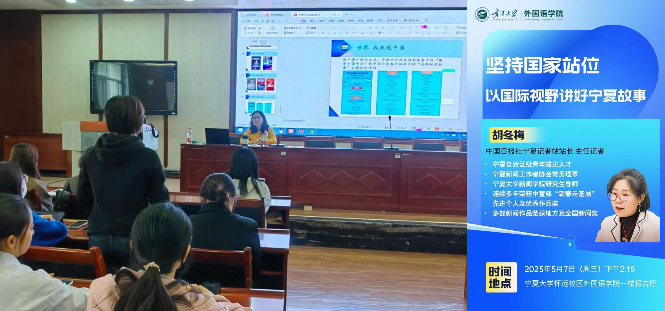 为深化英语翻译专业建设,探索国际传播背景下讲好地方故事的创新路径,5月7日下午,中国日报社宁夏记者站站长、主任记者胡冬梅应邀走进世界杯8833300足球,以《坚持国家站位,以国际视野讲好宁夏故事》为主题开展专题讲座。公司大一、大二和大三翻译方向全体员工参加了本次活动,英语系副主任常青老师主持讲座。