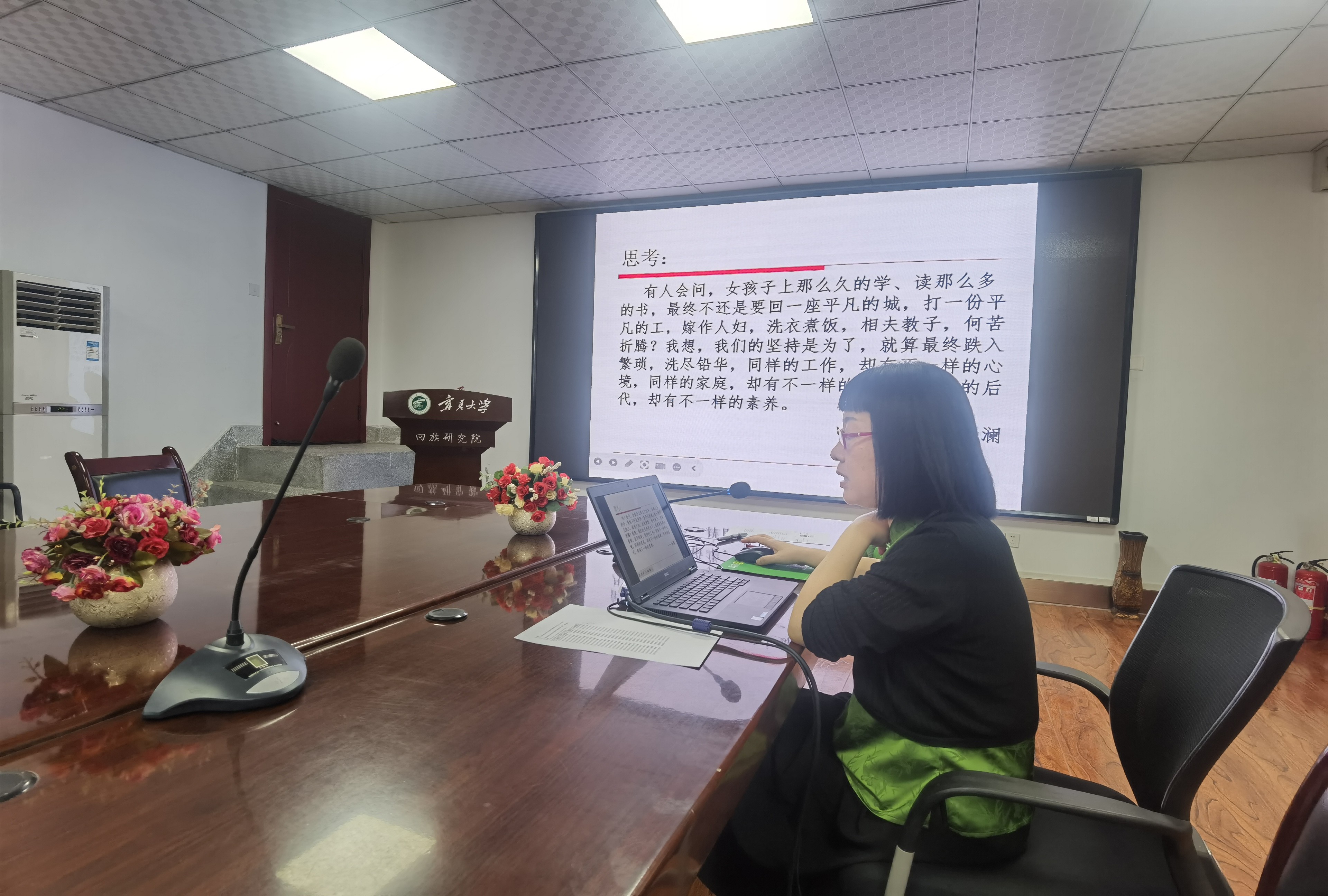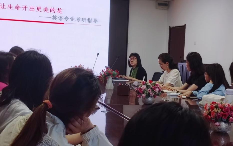 为助力员工明晰学业规划,提升考研保研竞争力,5月22日下午,2024级英语师范一班在逸夫楼307会议室开展了题为“让生命开出更美的花”的主题班会。会议由班主任文莉老师主持,公司副经理胡笑瑛教授担任主讲嘉宾,2024级英语师范一班全体同学参加会议。