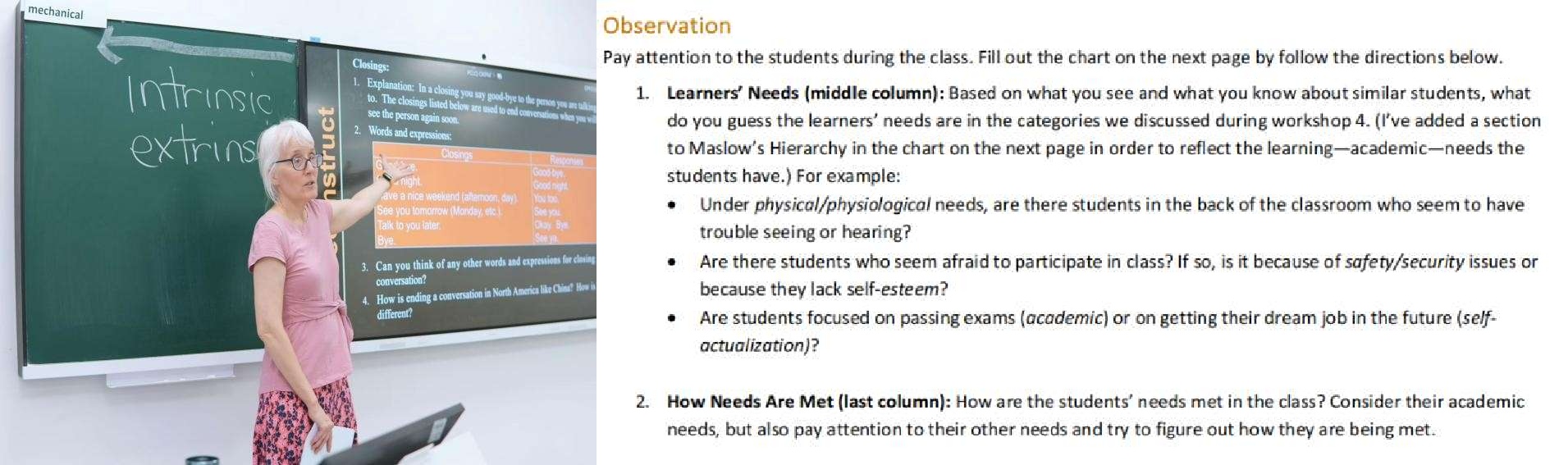 活动基于卓越班同学一周前观摩的小学英语课。在Melissa老师的指导下,同学们借助课堂观察量表对这堂课进行了记录。该量表将学习者需求细分为三大类别、六个递进层次,要求观摩员工记录课堂中学习者各项需求的具体体现及教师的应对策略。课后,同学们将观察数据整理成需求层级结构图(Hierarchy),并撰写了反思日志,重点剖析了“哪些需求被满足/忽视?”以及“如何助力后进生快乐高效学习?”两大关键问题。